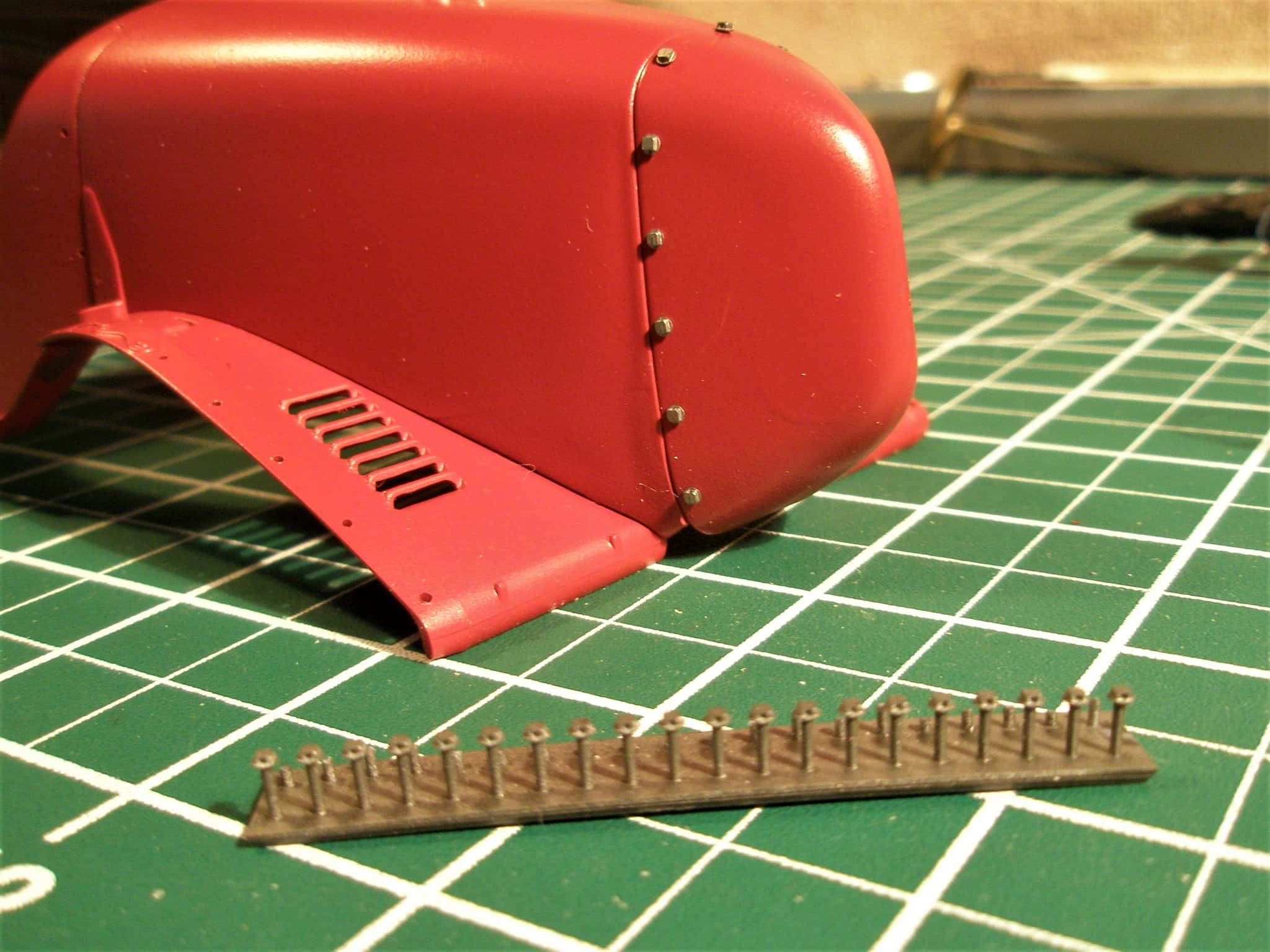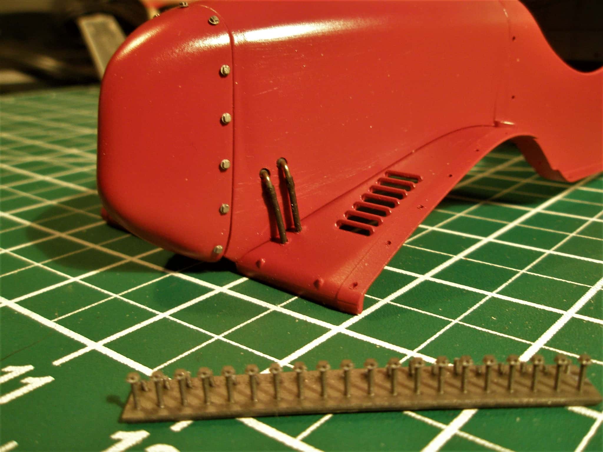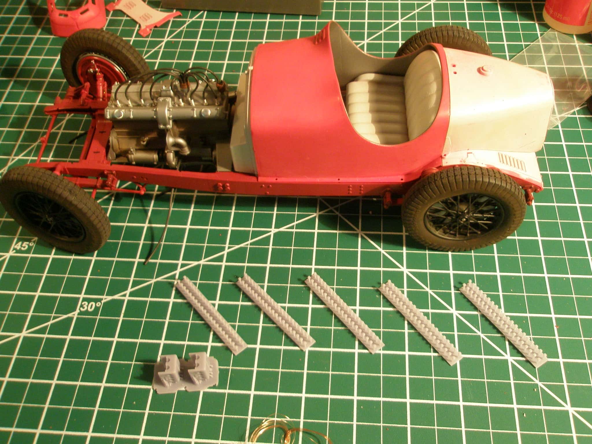This is a 1:12th scale Alfa Romeo 2300 Monza built from an Italeri kit. Many nuts, bolts and rivets from Model Motorcars were used to bring out the details on this model. Body panel lock bolts and safety wire were used, an unusual feature on a model done in 1:12th scale.