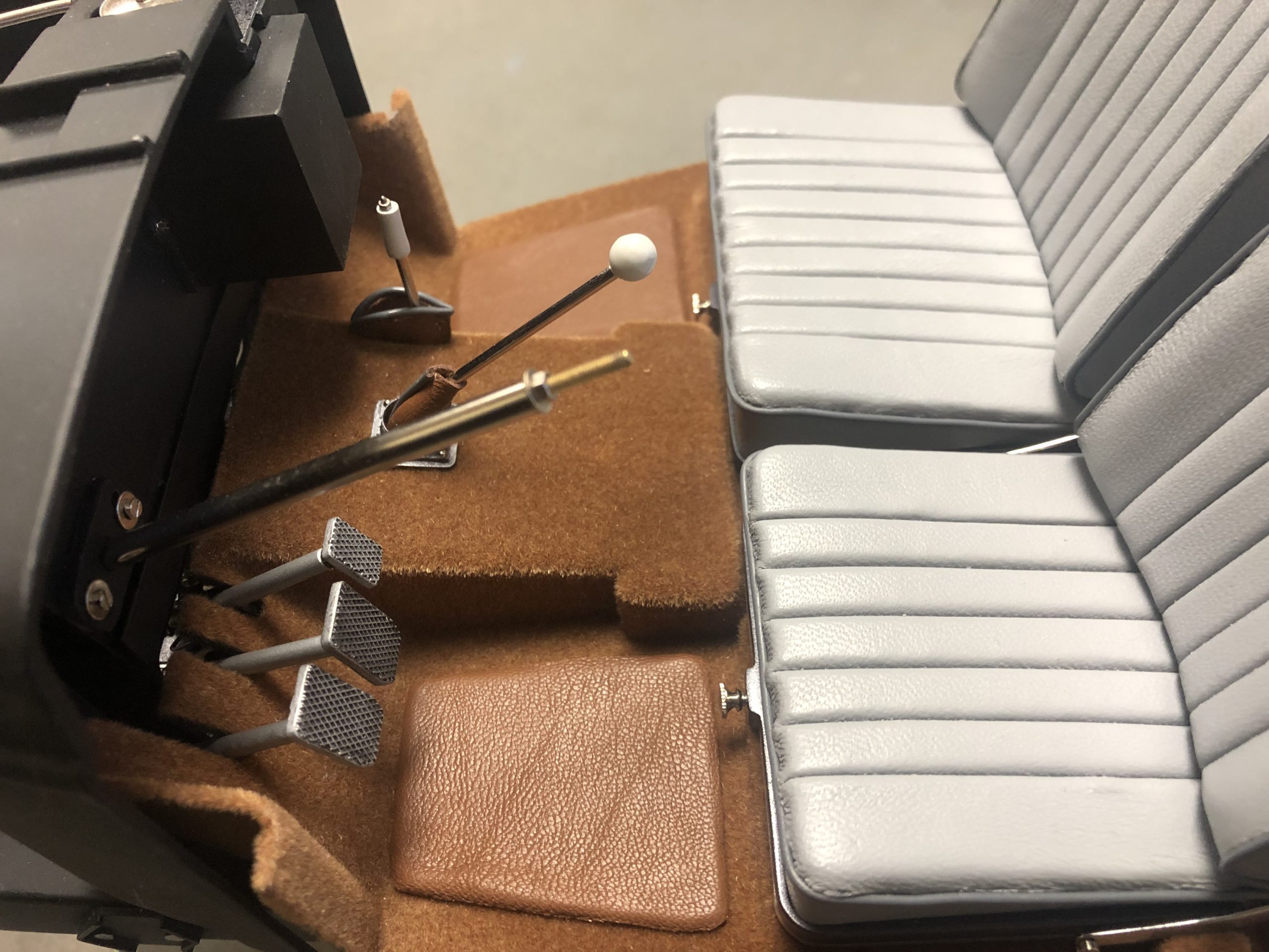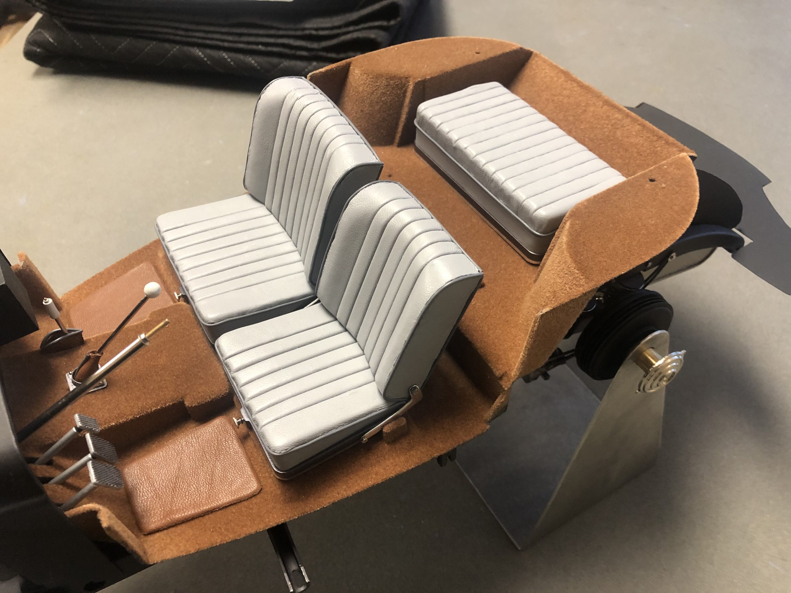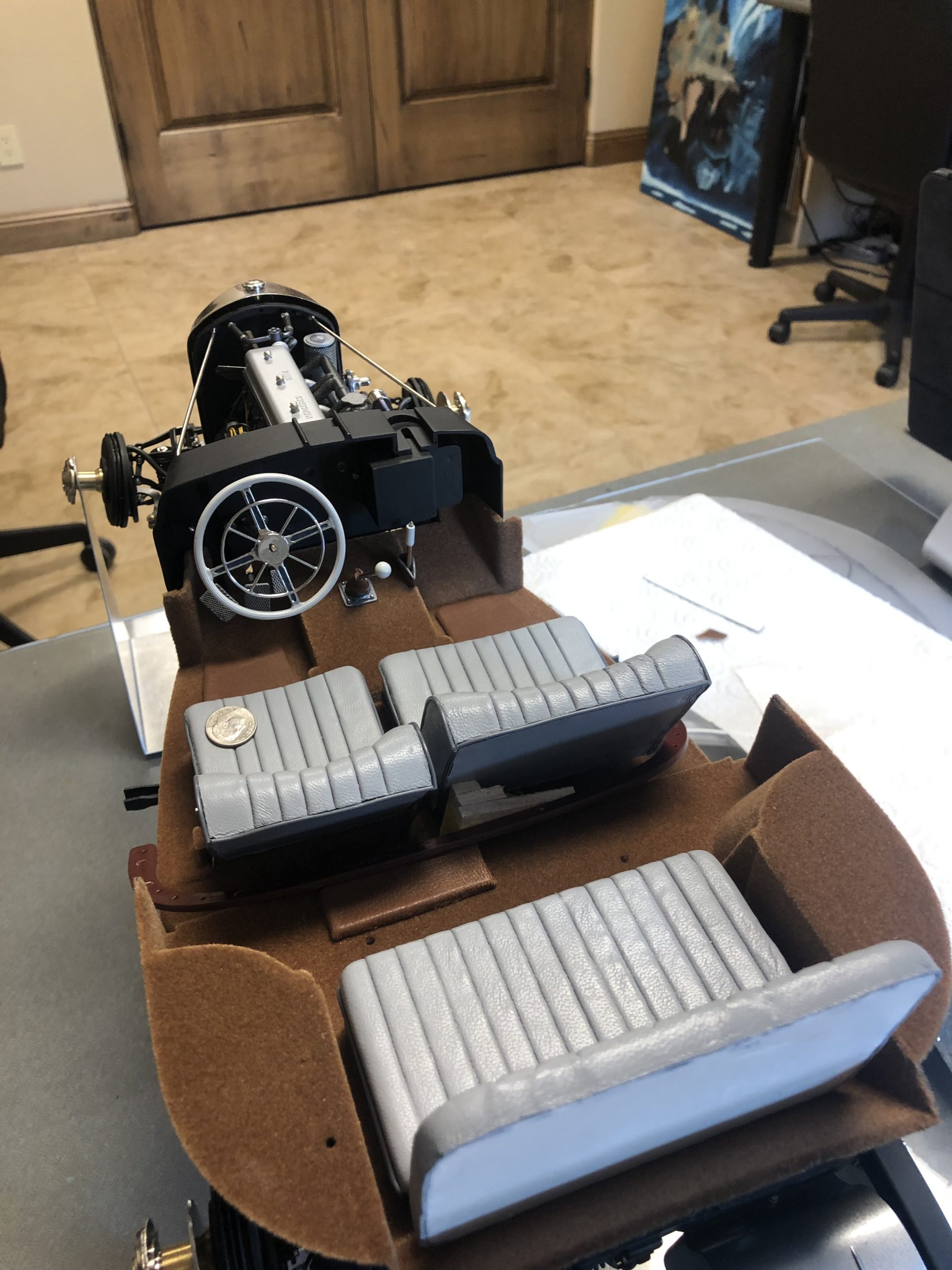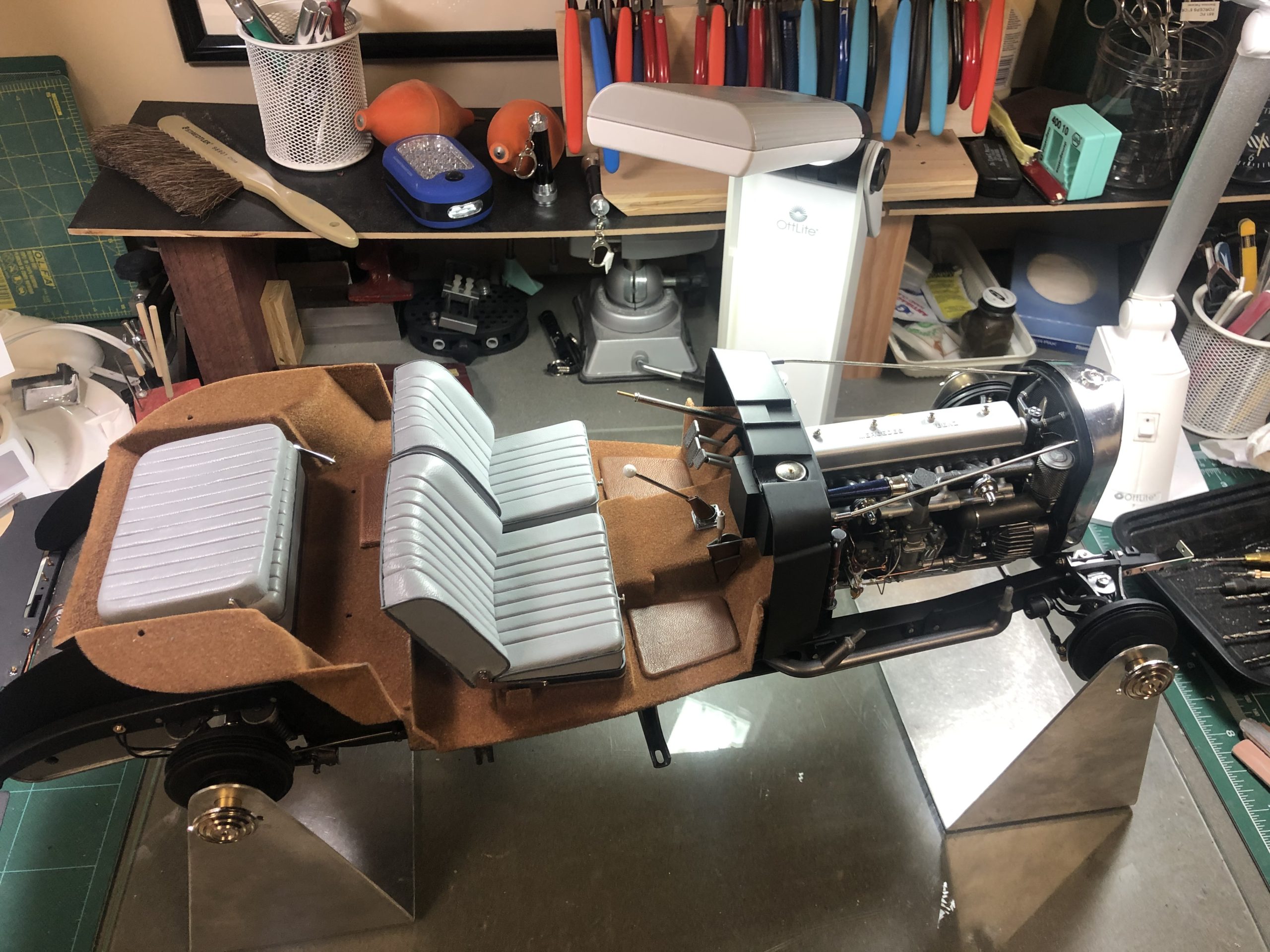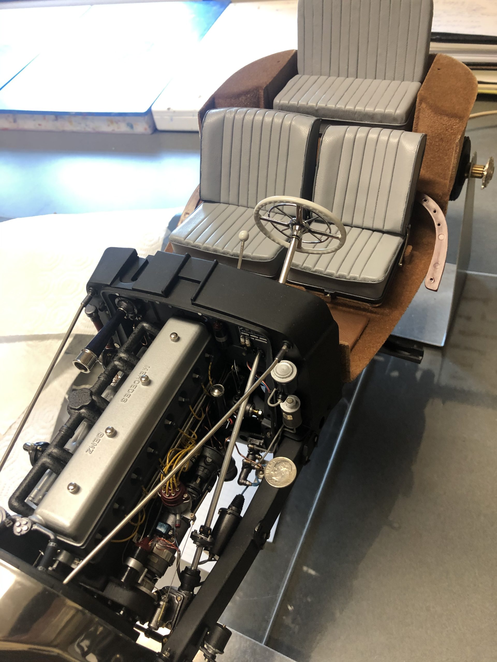 What rides on top of the floor boards is also a job to behold. From the two-tone dashboard with its mother-of-pearl insert to the MMLtd. steering wheel, this interior promises to be a delight. The neatly done gray leather seats, piped in a subtle darker gray, do not disappoint, and prove once again that there is no substitute for careful, patient work. The leather floor mats perfectly match the tan carpeting and echo the top of the dashboard for a unique solution to the challenge presented by the stock floor. Like all great models, Mr. Skowronski's Mercedes must be tempting to display just as it is, without the burden of a finished body, but judging from what we can see so far, the finished model will be well worth the wait. It is safe to say that the rest of the model will be as distinctive and imaginative as its underpinnings.
