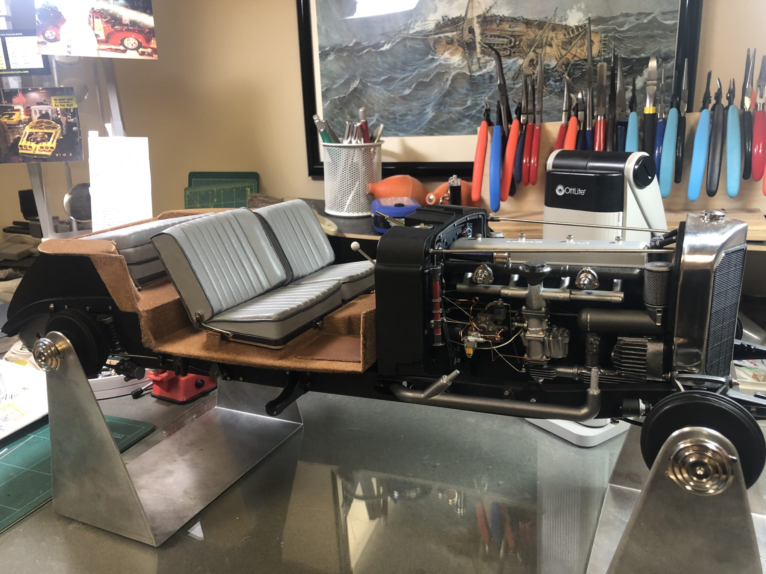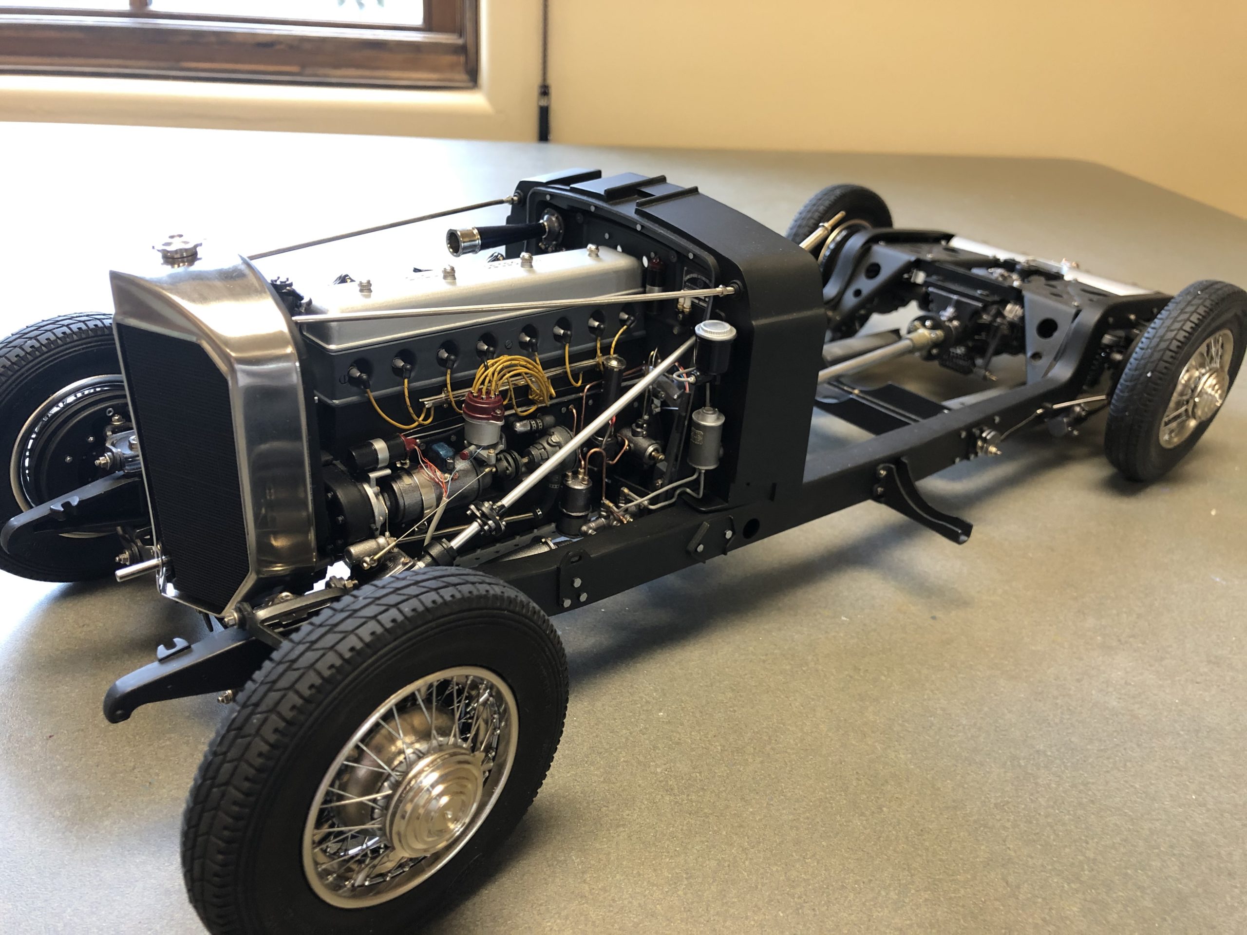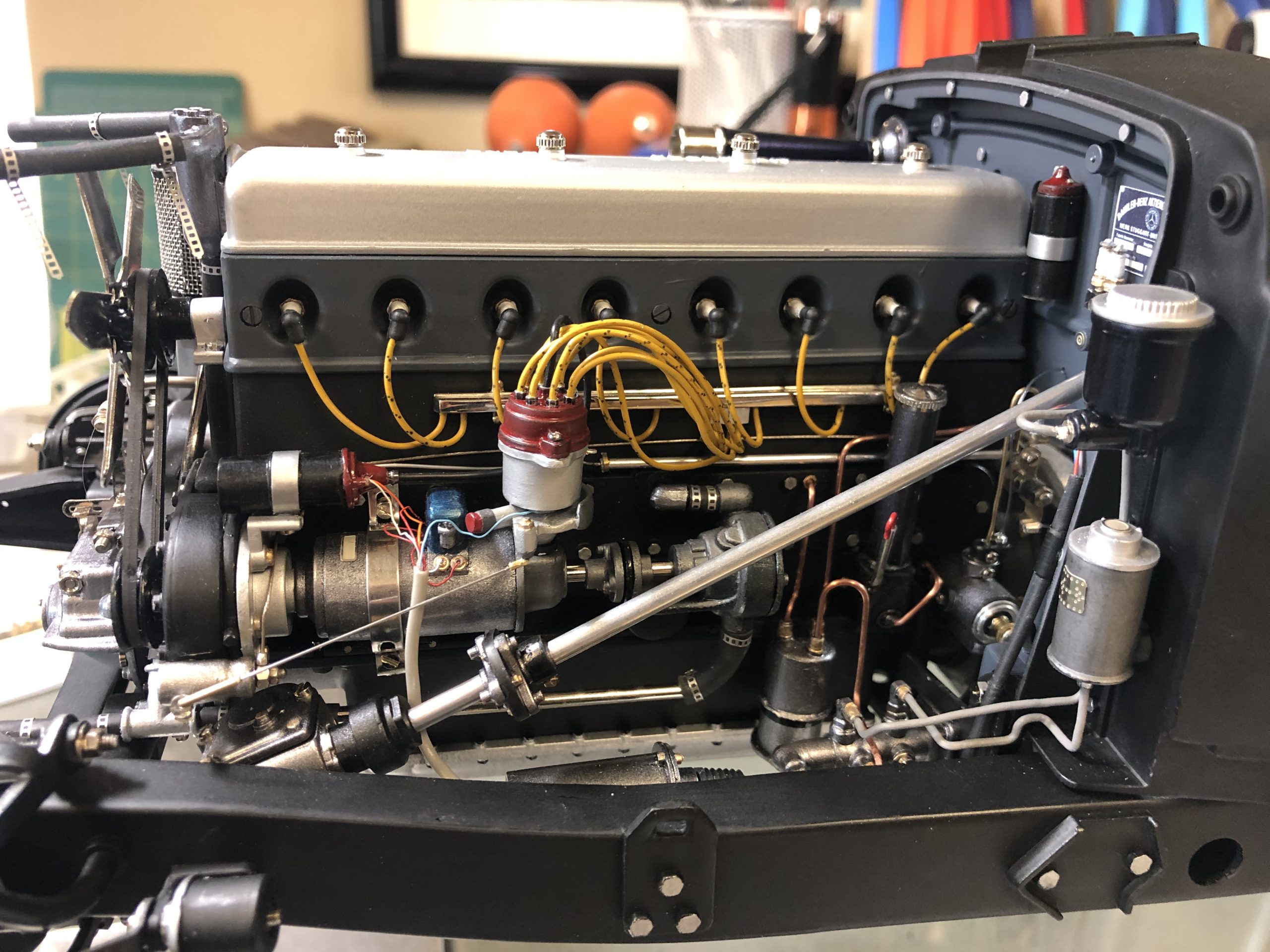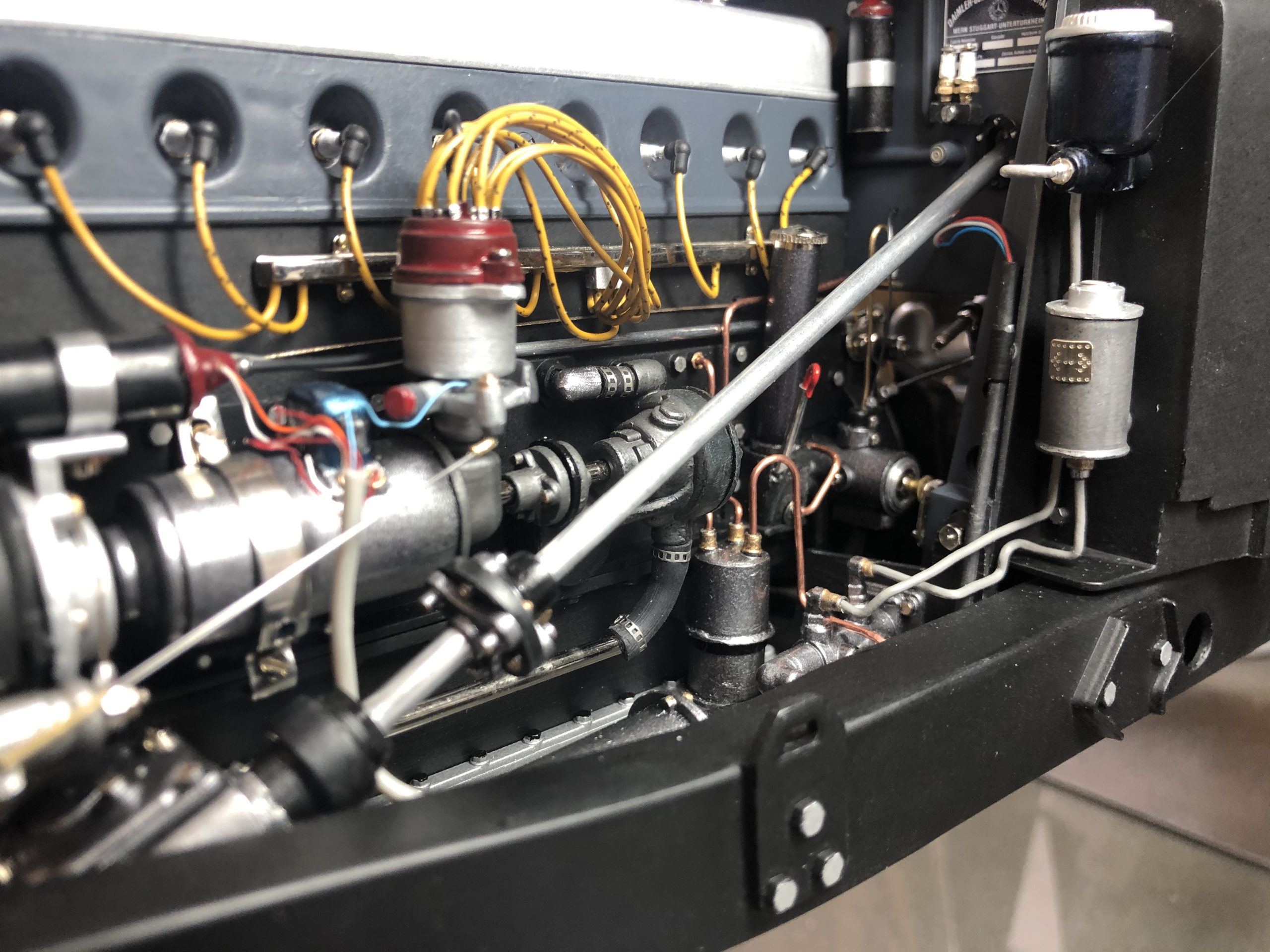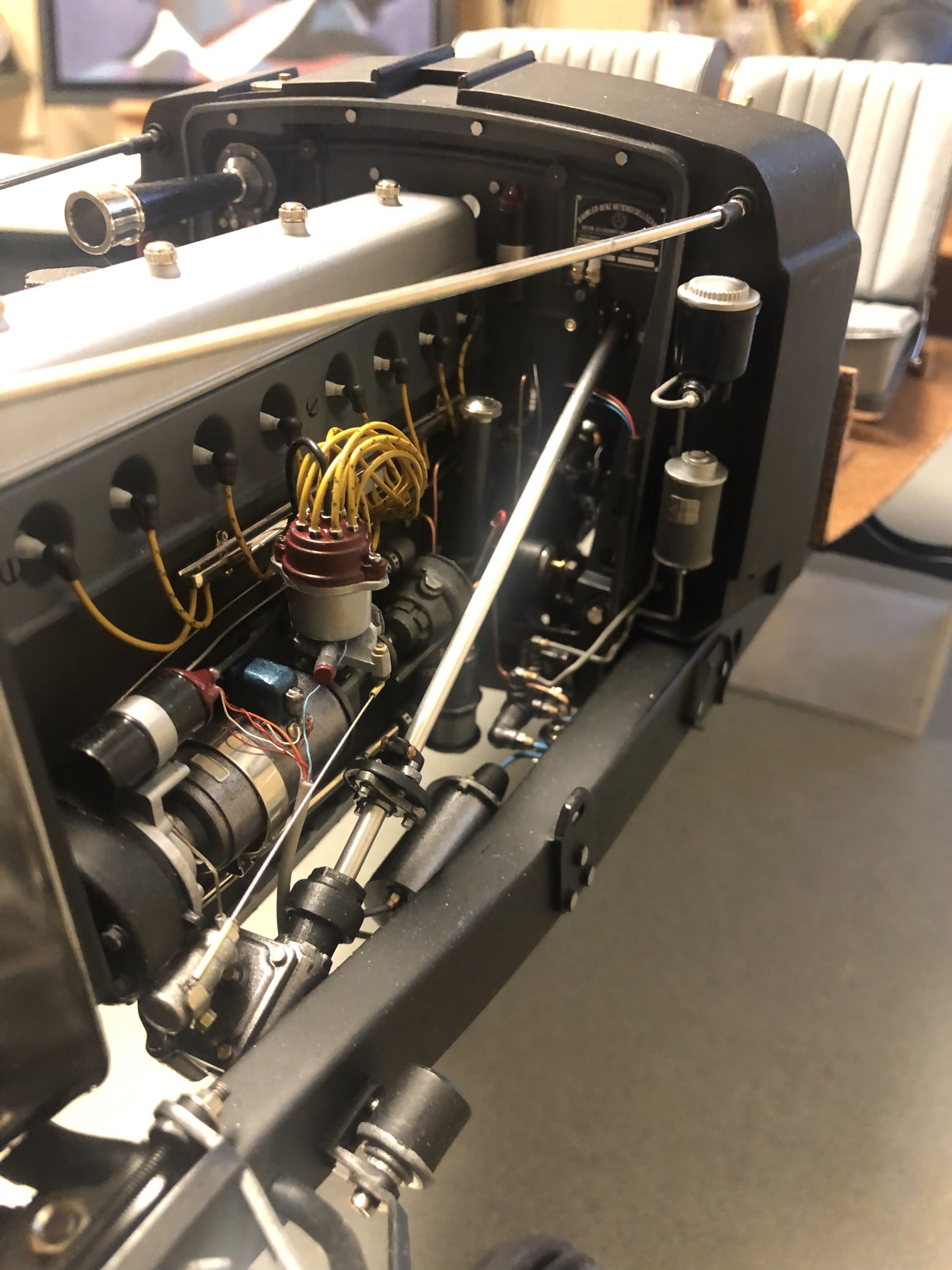 Part of our joy, naturally, is to see so many Model Motorcars, Ltd. components so expertly incorporated in the project, but make no mistake, Skowronski's attention to detail and fastidious workmanship are the stars of the show. The engine, which uses MMLtd. parts to become the later 540K version of the legendary Mercedes-Benz super-charged straight-eight, has the look and feel of the full-size version. Get the background right on this engine and the experts will be doing double-takes. Results like these can only be achieved by carefully studying photos of the prototype to identify the essential visual triggers that tell us we are seeing the real thing. The surfaces are flawless, the fit of the components is perfect, and the proportions are correct. Aluminum looks like aluminum, cast-iron looks textured, and painted sheet metal looks smooth and cool to the touch. The relocated fuel pump is a job to see, and its plumbing is enough to bring tears to the eyes of any restorer of the big ones.