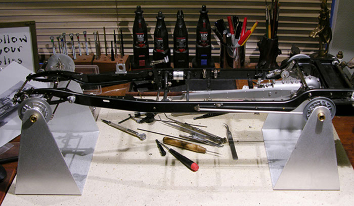 First the Rolls, then the Alfa, and now the Bugatti benefits from our Tom Vitale-designed, Darel Magee-built Bugatti Chassis Stands. These dandy aircraft-aluminum stands are just the thing to keep your Bugatti from rolling around the bench just as you are trying to adjust the cable brakes. No more improvised supports, no more damaged details—now the Bugatti Chassis Stands.