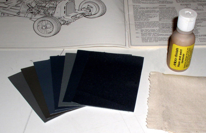 Each kit includes 6 sheets of cushioned abrasive cloths in 2400, 3200, 3600, 4000, 6000, and 8000 grits, a soft foam sanding block, a bottle of liquid polish and a soft flannel polishing cloth. Use this polishing kit to smooth the “orange peel” surface of a rough paint job, or put a mirror finish on good paint. Works on all painted surfaces, varnished wood, and bare plastics. It is also invaluable for creating varied finishes on raw metal parts, ranging anywhere from a dull sheen to a chrome like shine.