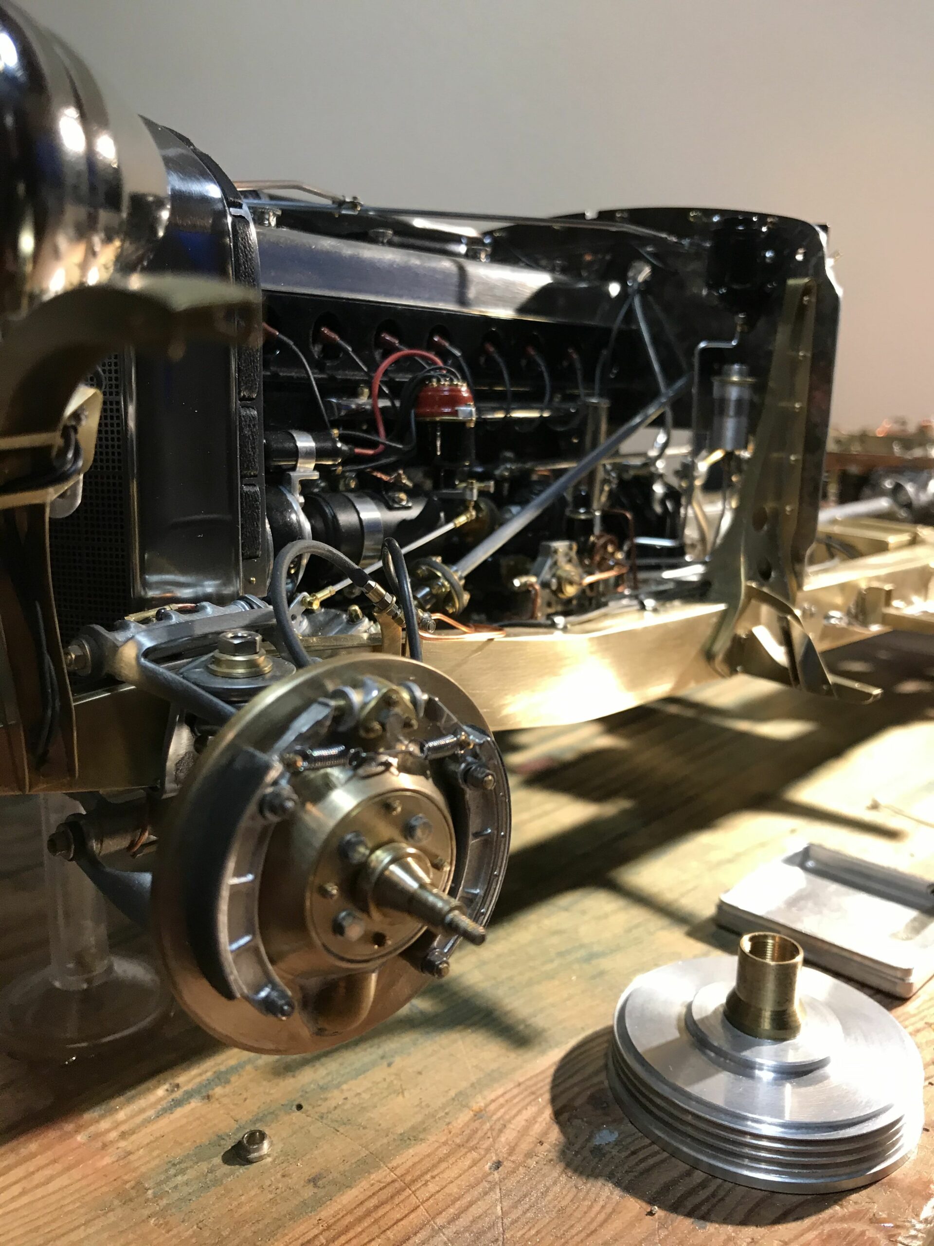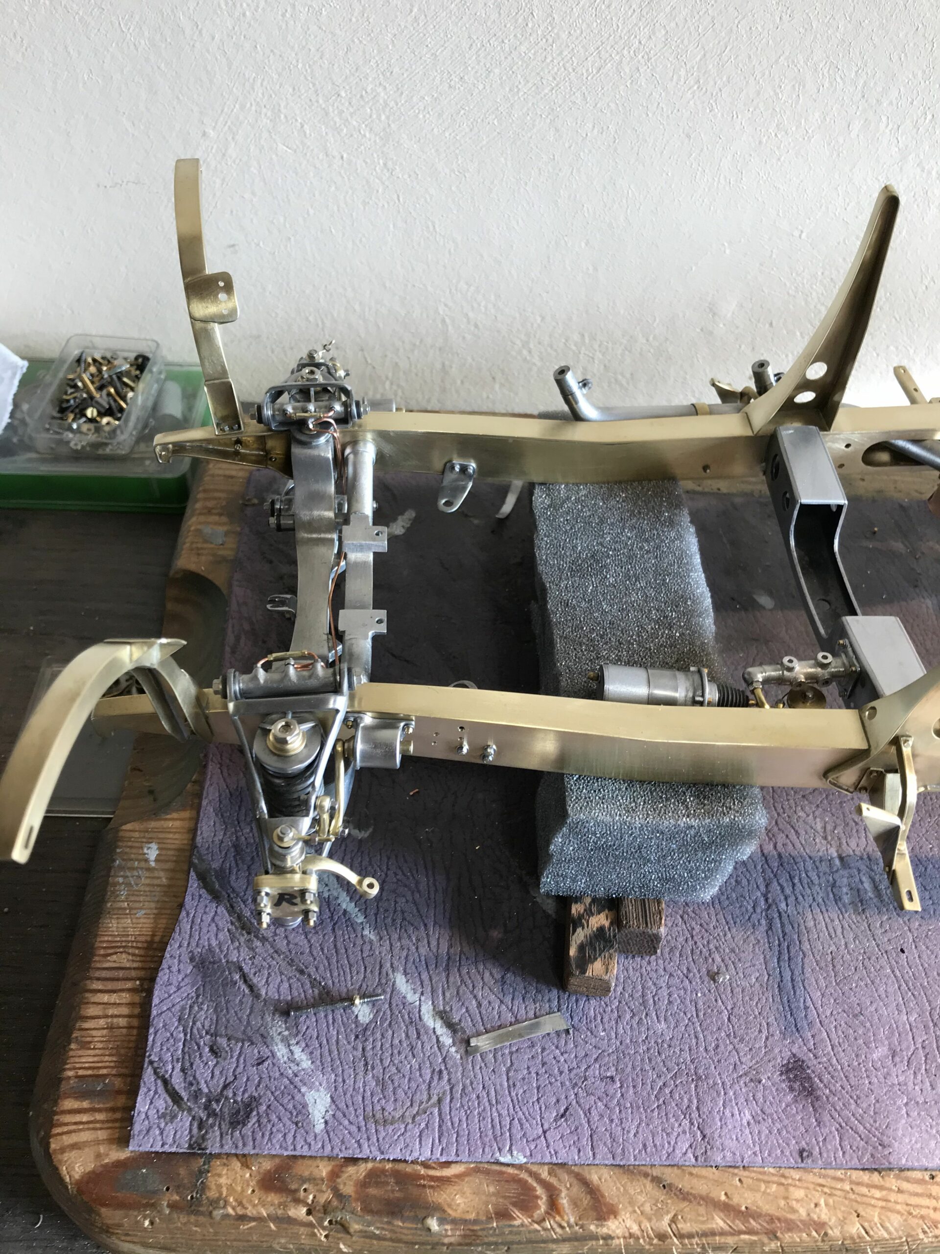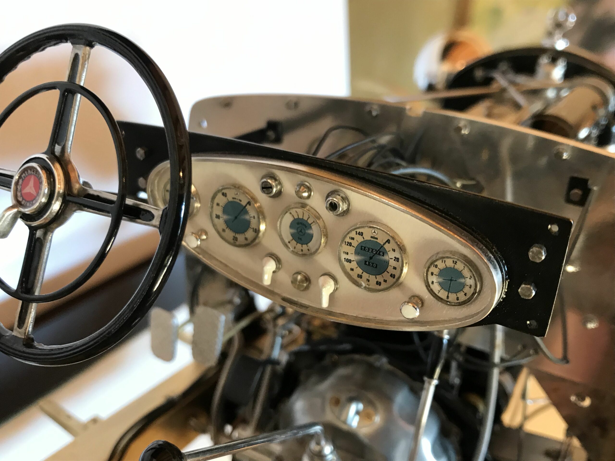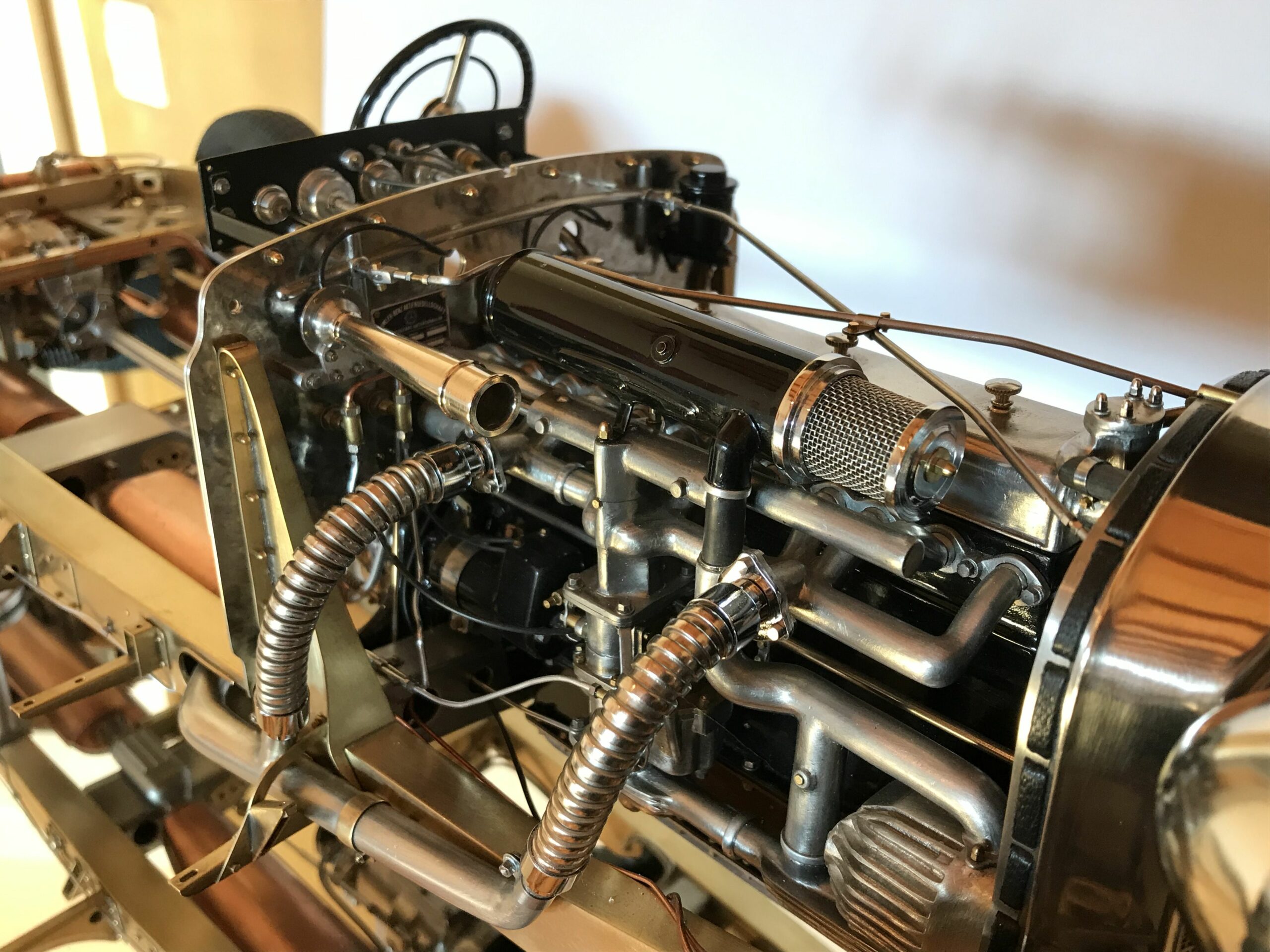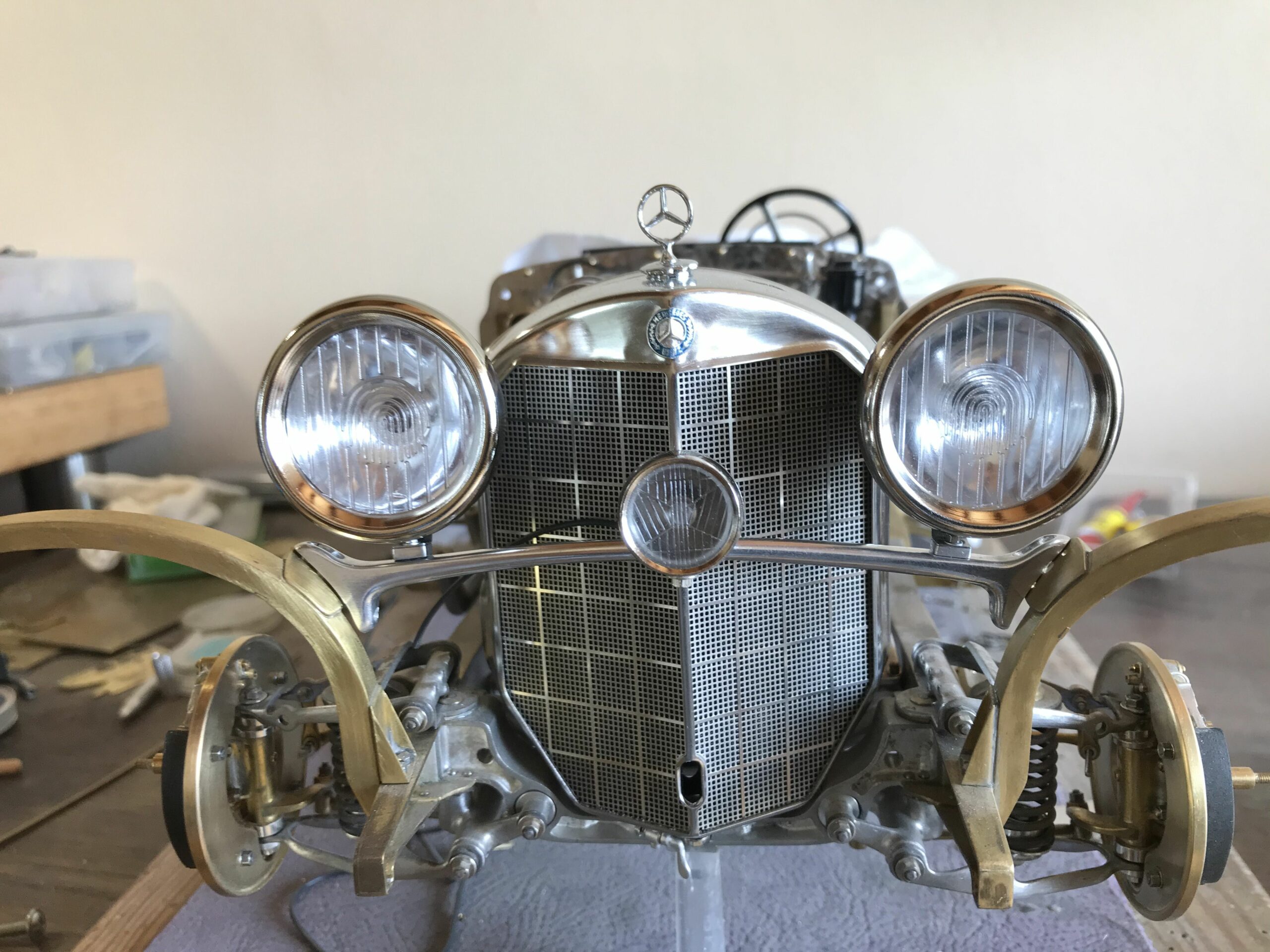 About 10 years ago I planned the project to build a kit of the Mercedes 500k from Pocher without a body to show the inner values of such a classic. I wanted to refine the kit for this stage as much as possible to show as much detail as possible. I was inspired by a book entitled "Mercedes Benz supercharged 8 (Volume 2)" that I bought during a visit to the Mercedes Museum in Stuttgart. After the initial construction period, it turned out to me that the Pocher kit did not meet my requirements and I began to replace every part that was not authentic enough by either rebuilding it, making it by hand from metal or of course ordering it from you via the platform . For example, I only used the plastic parts of the motor to make molds out of them so that I could cast them in a tin-bismuth alloy. I also have that with many other parts such as the transmission block, rear axle, brake shoes or steering wheel. The engine block and the large cast parts are all hollow and have the same parts and functions as the Pocher model - but made of metal. I had the turned parts such as brake drums made in a workshop because I don't have a lathe. The model is completely made of metal, weighs approx. 5 kg and consists of only 10% (wheels, radiator and parts of the chassis) from parts of the purchased kit. The supplier of the screws from 0.6 to 1.8 mm financed a vacation in the Maldives from my orders (at least I think). The Pocher kit can still be used to some extent as a spare parts store. Building the model gave me a lot of pleasure because every time I opened the book, I discovered new details that I could add.